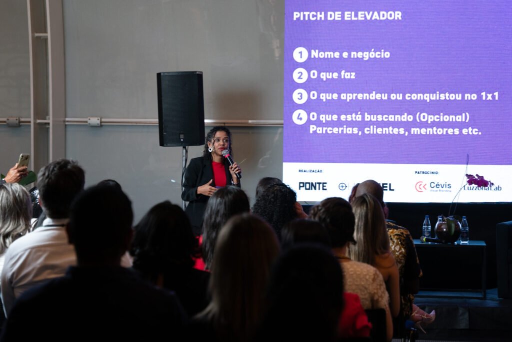 Quem cumpriu o desafio teve a chance de subir ao palco para um pitch de 1 minuto. Caso estourasse o tempo, uma buzina soava imediatamente, gerando risadas, descontração e, ao mesmo tempo, estimulando a objetividade — uma habilidade essencial no ambiente de negócios.