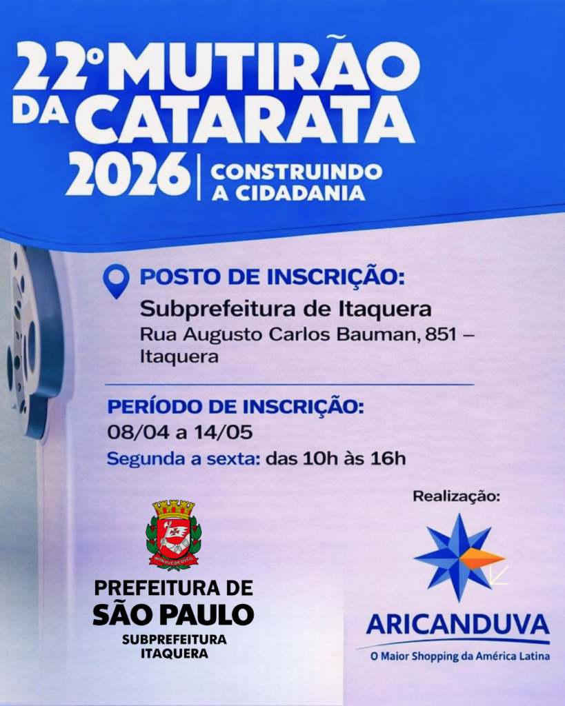A 22ª edição do Mutirão da Catarata está com inscrições abertas para moradores da Zona Leste de São Paulo. A iniciativa, fruto da parceria entre o Centro Comercial Aricanduva e a Subprefeitura Itaquera, com apoio do subprefeito Rafael Limonta, oferece encaminhamento gratuito para consultas, exames e cirurgias oftalmológicas à população da região.